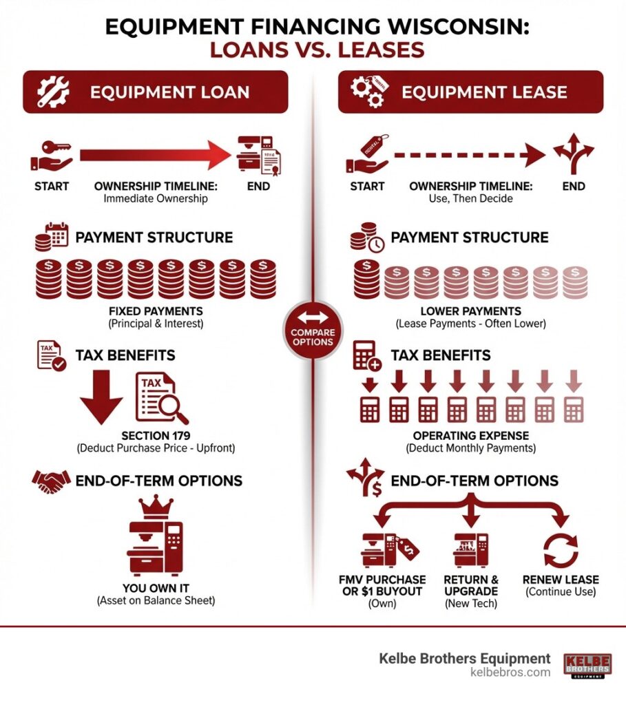 When considering equipment financing Wisconsin, our businesses have two primary paths: equipment loans or equipment leases. Both serve the goal of acquiring necessary machinery, but they differ significantly in terms of ownership, financial structure, and end-of-term options. Understanding these distinctions is crucial for making an informed decision that aligns with your operational and financial goals.
